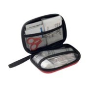 Apteczka pierwszej pomocy w twardym etui z PU. Zawiera 2 rękawiczki, 1 koc, 1 taśmę, 2 bandaże, 1 nożyczki, 4 waciki, 10 plastrów i 6 chusteczek czyszczących. Niedostępna w sprzedaży poza UE.