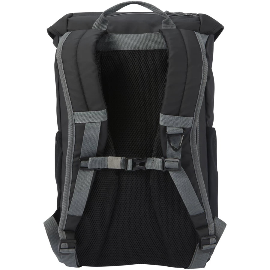 Wodoodporny plecak na laptopa wykonany z materiałów z recyklingu posiadających certyfikat GRS, w tym zamków błyskawicznych. Posiada przestronną przegrodę na laptopa o ekranie 15,6" ze sznurkiem ściągającym i regulowanymi klamrami, aby zmaksymalizować przestrzeń do przechowywania pod klapą. Ten plecak ma wiele kieszeni, w tym zapinaną na zamek przednią kieszeń z elastycznymi sznurkami do przechowywania i organizowania oraz odblaskowe lamówki zapewniające widoczność. Wyprofilowany i wyściełany spód oraz regulowany pasek na klatkę piersiową sprawiają, że jest wygodny do noszenia nawet, gdy jest w pełni załadowany. Materiały z recyklingu GRS obejmują główny materiał, podszewkę, taśmy i zamki błyskawiczne. Pojemność: 23 litrów. Wolne od PVC.
