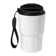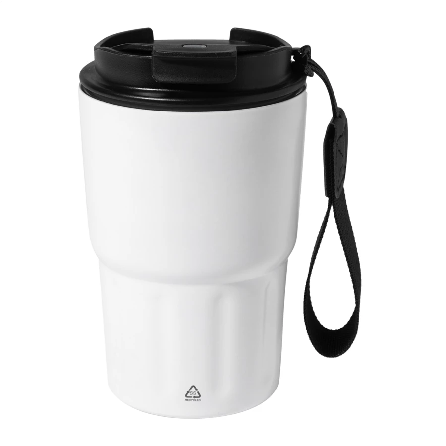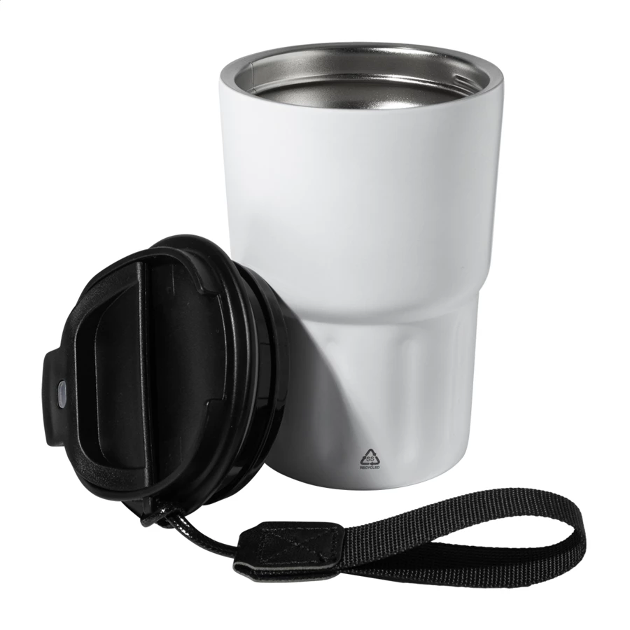 Kubek termiczny z podwójną ścianką, wykonany z recyklingowanej stali nierdzewnej, z pokrywką z PP. Z paskiem do przenoszenia z poliestru RPET. Pojemność 350 ml.