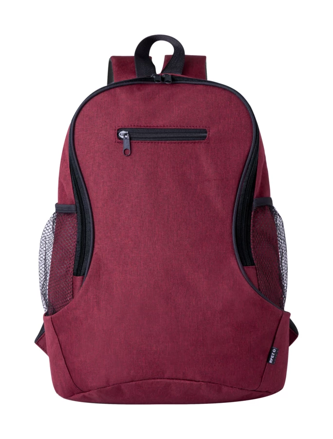 Plecak RPET z komorą zapinaną na zamek i przednią kieszenią, bocznymi kieszeniami z siateczki, wyściełanymi plecami i szelkami. Poliester 300D RPET z charakterystyczną metką RPET.