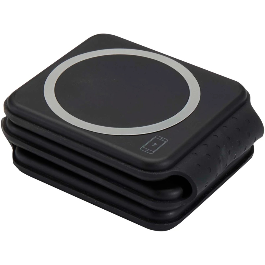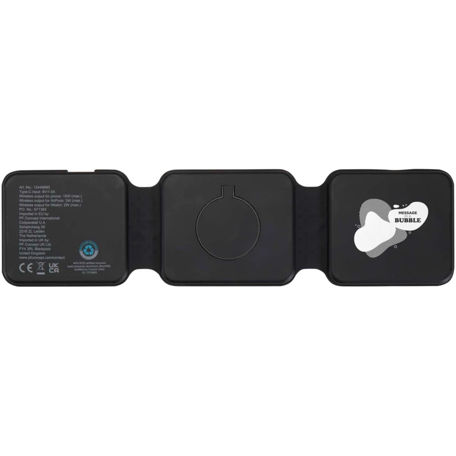 Ładowarka bezprzewodowa Armus 3 w 1 jest wykonana z tworzyw sztucznych pochodzących z recyklingu i może jednocześnie ładować smartfon, słuchawki AirPods oraz zegarek iWatch z prędkością ładowania bezprzewodowego do 15 W. Składana, magnetyczna konstrukcja pozwala na ustawienie telefonu w poziomie, co idealnie się sprawda w przypadku oglądania filmów podczas ładowania. Kompatybilna ze wszystkimi telefonami z funkcją ładowania bezprzewodowego, w tym iPhone 12 i nowszymi (lub telefonami z pierścieniem magnetycznym). W zestawie złącze typu C.