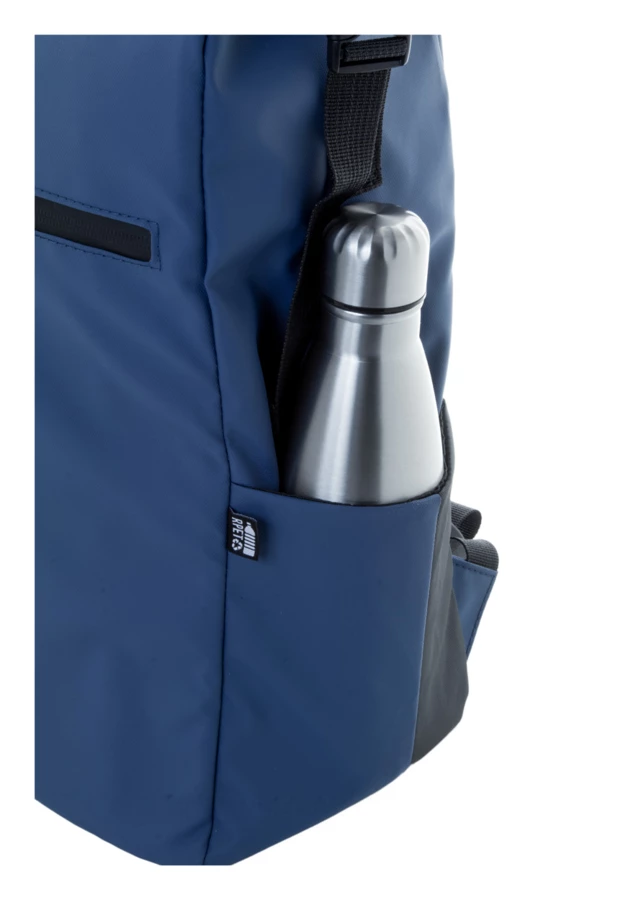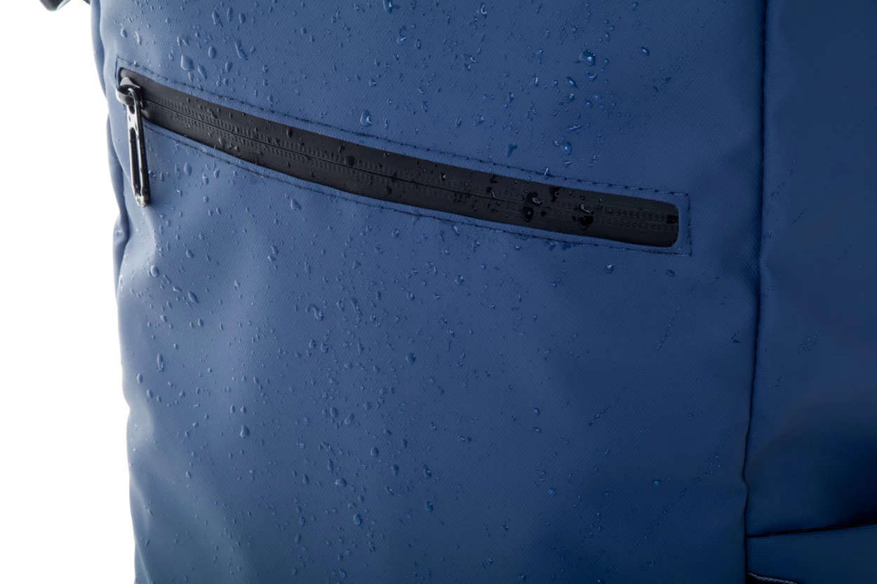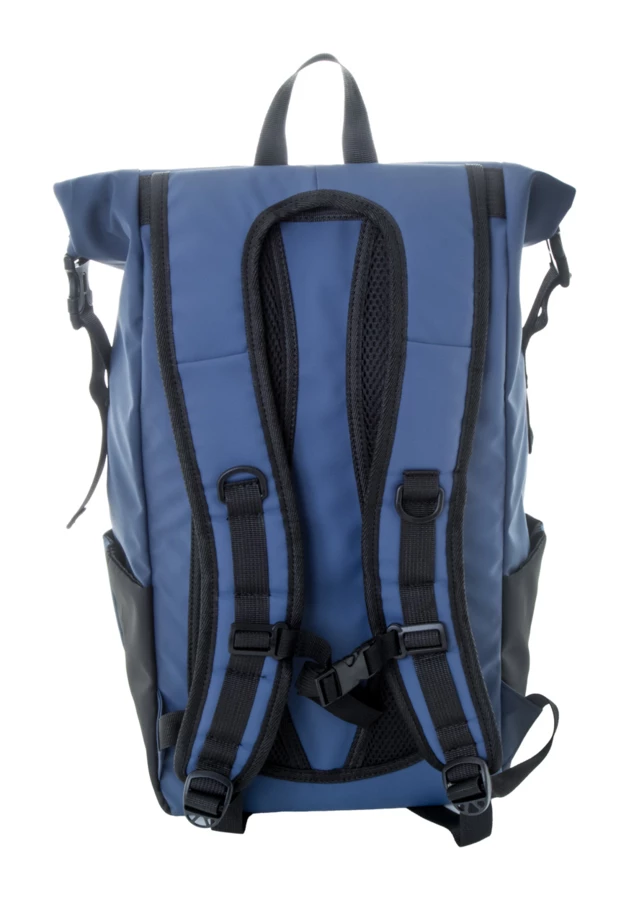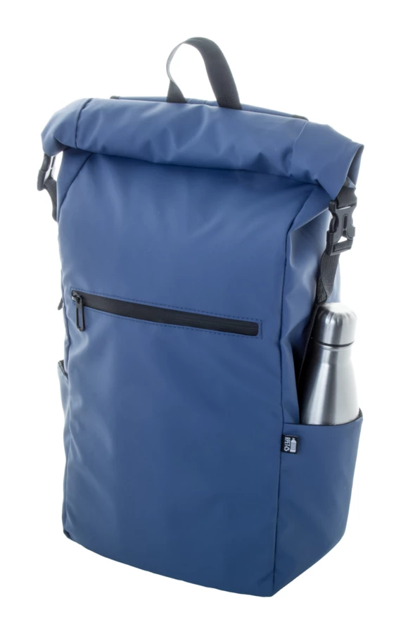 Wodoodporny plecak zwijany z RPET z klamrą i zapięciem na rzep, wyściełaną przegrodą na laptop (16") i tablet (10"). Przednia kieszeń zapinana na zamek. Posiada kieszenie boczne, wyściełane plecy i paski na ramiona. Poliester 600D RPET powlekany PU, z charakterystyczną metką RPET.