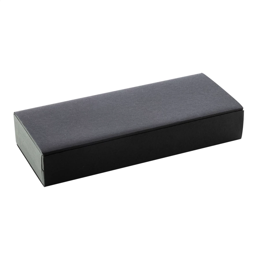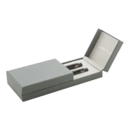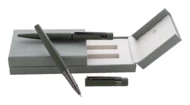 Elegancki, metalowy zestaw składający się z długopisu i pióra kulkowego z błyszczącymi, grafitowymi detalami. W pasującym kolorystycznie pudełku prezentowym, z niebieskim wkładem. Produkt marki André Philippe.