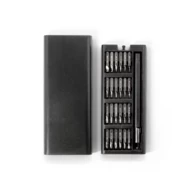 Zestaw śrubokrętów z magnetycznymi końcówkami, które można zmieniać w zależności od potrzeb. Pudełko wykonane jest z recyklingowanego tworzywa ABS (100% rABS), posiada magnetyczne zamknięcie i zatrzask, a także zawiera 1 rękojeść śrubokręta i 24 końcówki ze stali węglowej. Wiertła o twardości Rockwella HRC 45. Dostarczane w pudełku prezentowym z papieru pakowego. 166 x 67 x 18 mm
