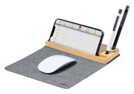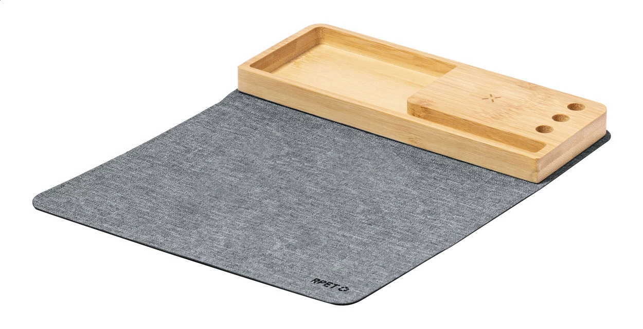 Składana podkładka pod mysz z poliestru RPET z silikonową podstawą. Z wbudowaną indukcyjną szybką ładowarką (15W) i bambusowym uchwytem na telefon. Poliester 300D RPET. Zawiera kabel USB.