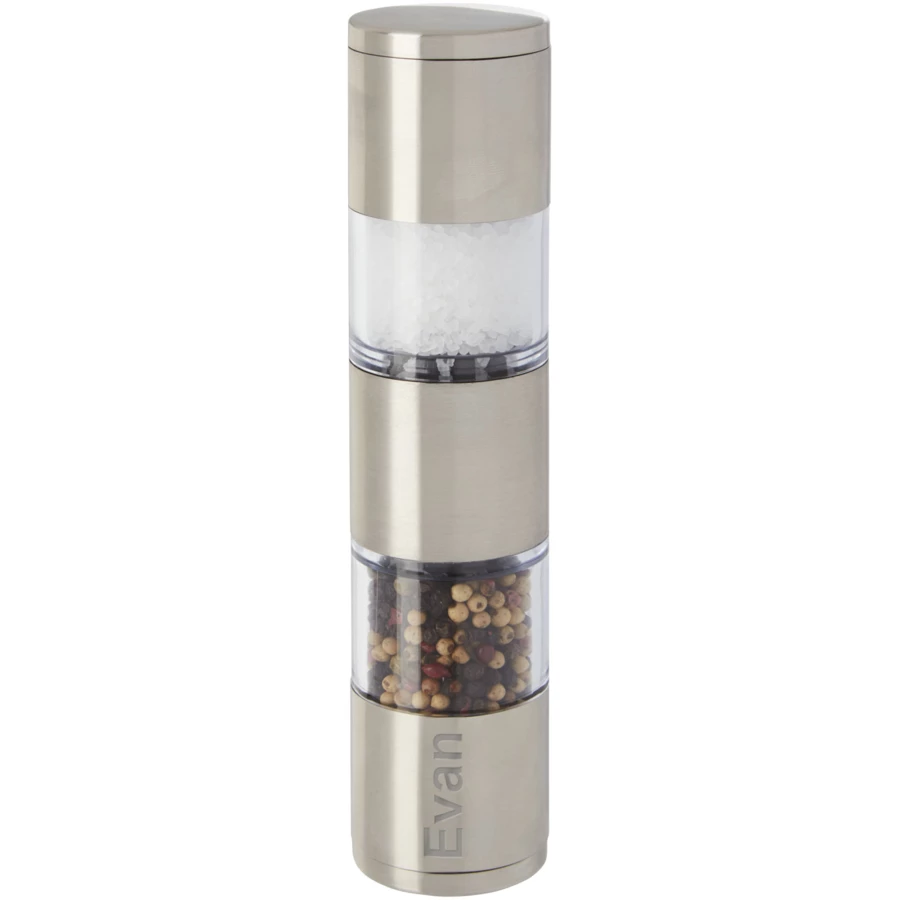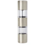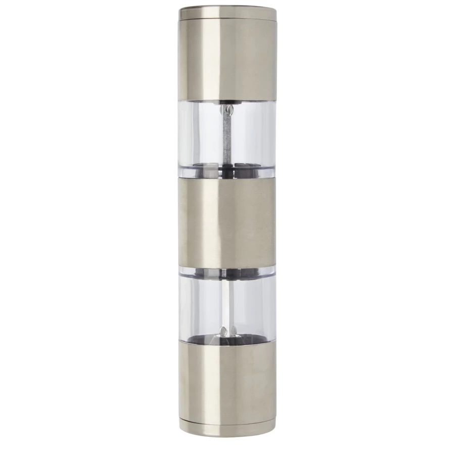 2-stronny młynek z jedną końcówką do soli i drugą do pieprzu. Pieprz i sól nie wchodzą w skład zestawu. Może pomieścić 50 g soli i 36 g pieprzu. Pojemność: 80 ml.