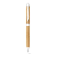 Długopis z bambusa z metalowym klipsem.Posiada niebieski wkład i mechanizm obrotowy. Zapakowany w bambusowe pudełko prezentowe z przesuwanym wieczkiem i okładką z papieru pochodzącego w 100% z recyklingu. Ponieważ produkt jest wykonany z naturalnych materiałów, kolor produktu oraz wynik drukowania mogą się różnić w zależności od produktu. 24 x 152 x 23 mm