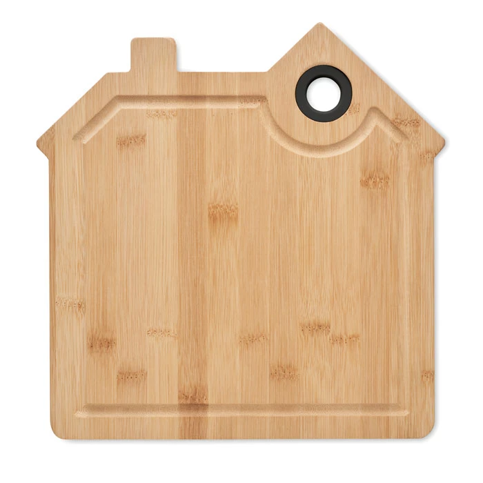 Bambusowa deska do krojenia w kształcie domu z rowkiem i otworem do zawieszenia. Bambus jest produktem naturalnym, dlatego mogą wystąpić nieznaczne różnice w kolorze, wzorze i rozmiarze.