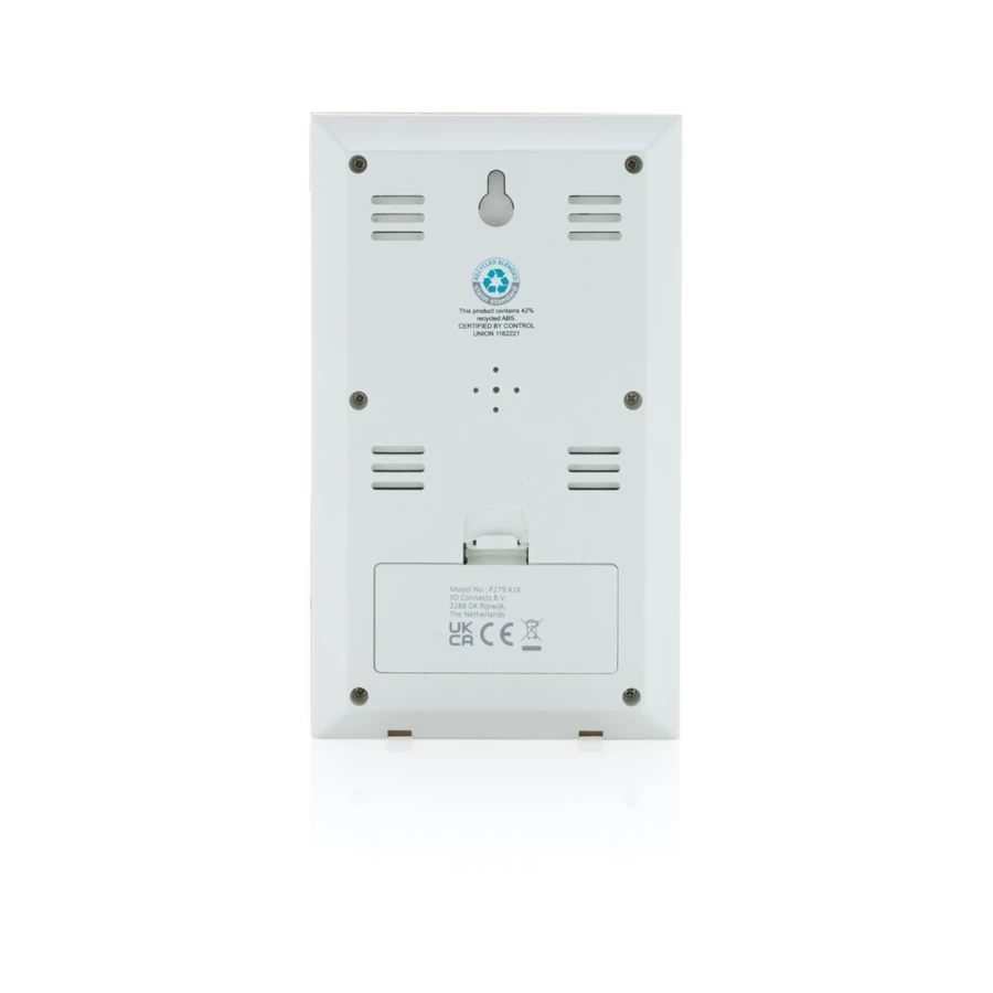 Stacja pogodowa, wykonana z certyfikowanego ABS z recyklingu oraz bambusa z certyfikatem FSC®, zawartość materiałów z recyklingu obliczona na podstawie wagi całkowitej przedmiotu: 42%, funkcje: temperatura, data, czas, wilgotnośc powietrza, baterie w komplecie, w pudełku kraftowym z certyfikatem FSC® mix, ślad węglowy produktu: 0,82 kg CO2