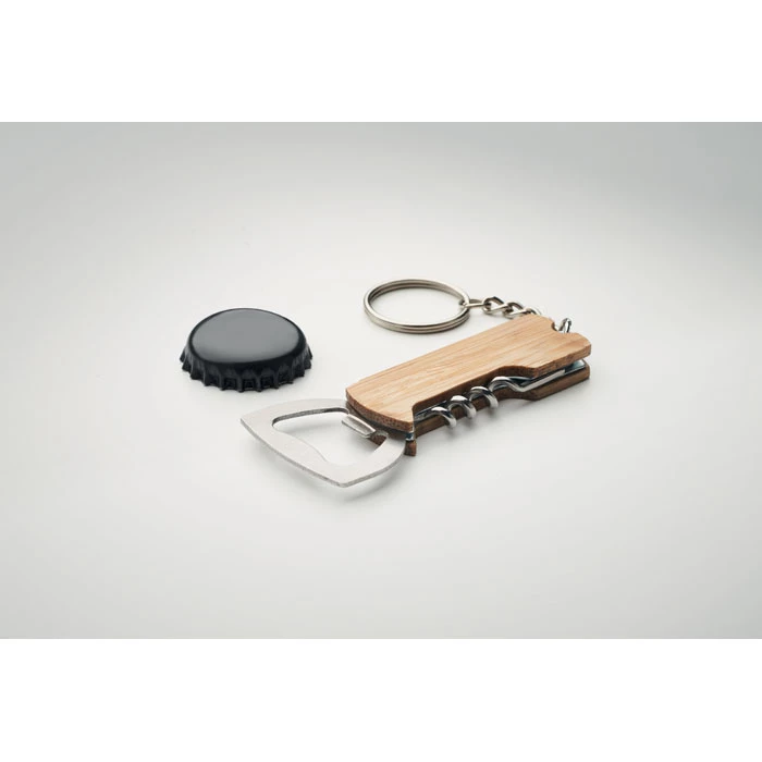 Narzędzie kieszonkowe 3 w 1 wykonane z bambusa z brelokiem na klucze. Zawiera otwieracz do butelek, korkociąg do wina i scyzoryk.