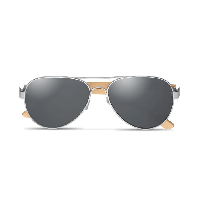 Okulary przeciwsłoneczne z bambusowymi zausznikami i kolorowymi lustrzanymi soczewkami w etui z mikrofibry. Ochrona UV400. Bambus jest produktem naturalnym, dlatego mogą wystąpić nieznaczne różnice w kolorze, wzorze i rozmiarze.