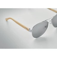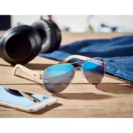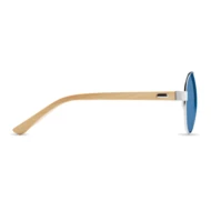 Okulary przeciwsłoneczne z bambusowymi zausznikami i kolorowymi lustrzanymi soczewkami w etui z mikrofibry. Ochrona UV400. Bambus jest produktem naturalnym, dlatego mogą wystąpić nieznaczne różnice w kolorze, wzorze i rozmiarze.