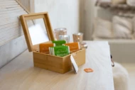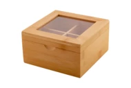 Bambusowe pudełko do przechowywania herbaty z przezroczystą akrylową pokrywką i 4 przegródkami.