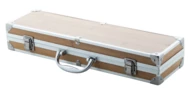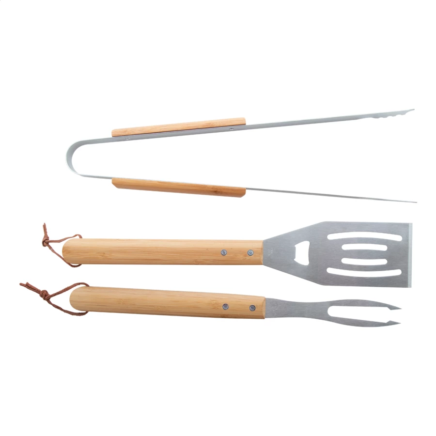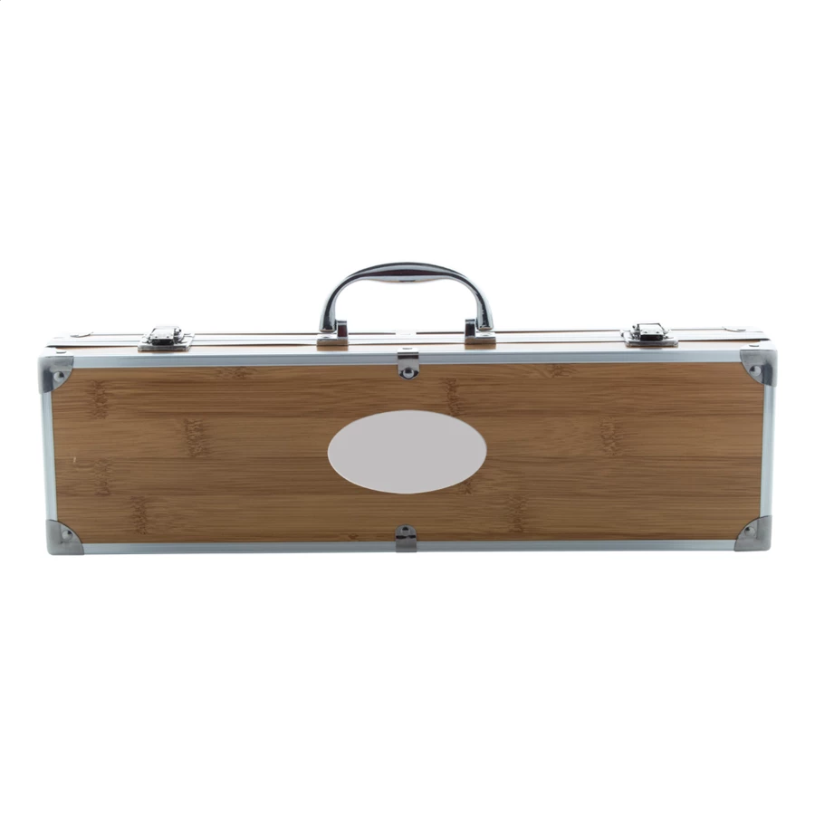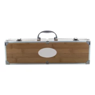 Zestaw do grilla ze stali nierdzewnej i bambusa (widelec, szczypce i łopatka z otwieraczem do butelek). W walizce aluminiowej z bambusowym wzorem.