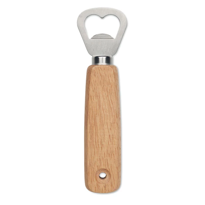 Barmański otwieracz do butelek z uchwytem z drewna kauczukowego.