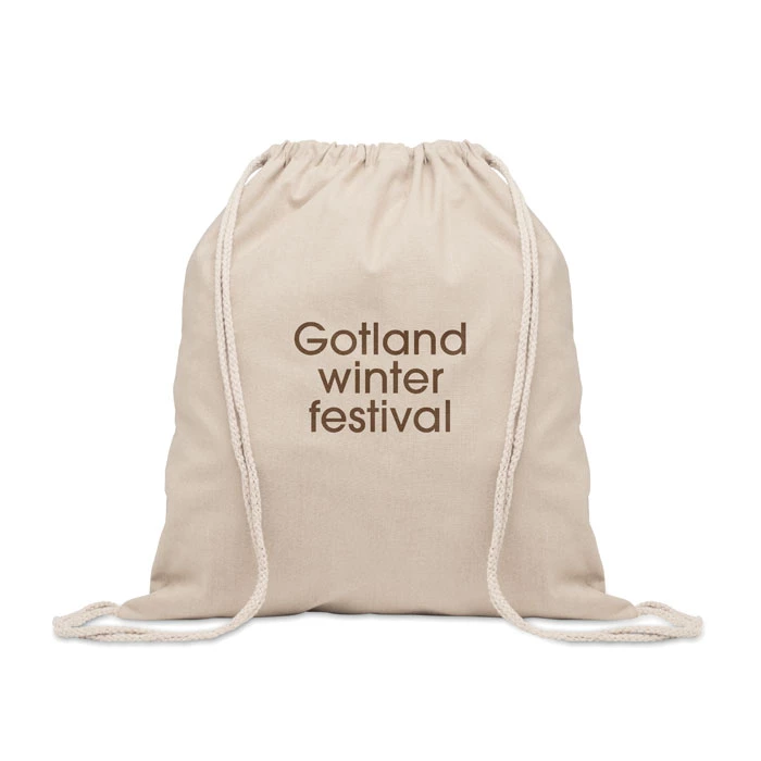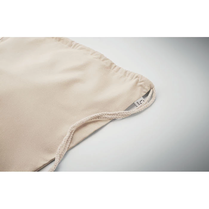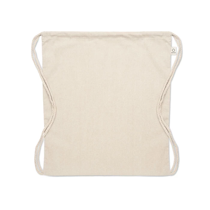 Worek ze sznurkiem wykonany z przetworzonej bawełny (70%) i RPET (30%). 140 gr/m². Ten produkt może się kurczyć po zadrukowaniu.