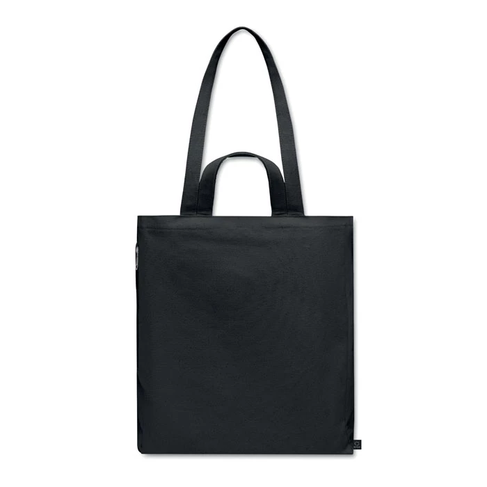 Torba zakupowa lub plażowa z polibawełny z recyklingu (70% bawełna z recyklingu, 30% poliester z recyklingu) z krótkimi i długimi uchwytami. 380 gr/m².