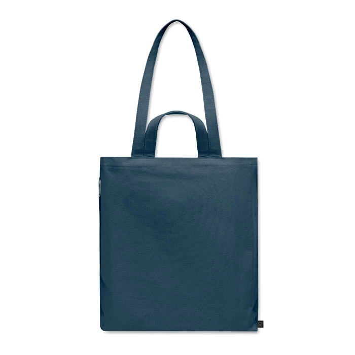 Torba zakupowa lub plażowa z polibawełny z recyklingu (70% bawełna z recyklingu, 30% poliester z recyklingu) z krótkimi i długimi uchwytami. 380 gr/m².