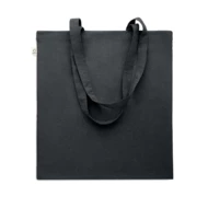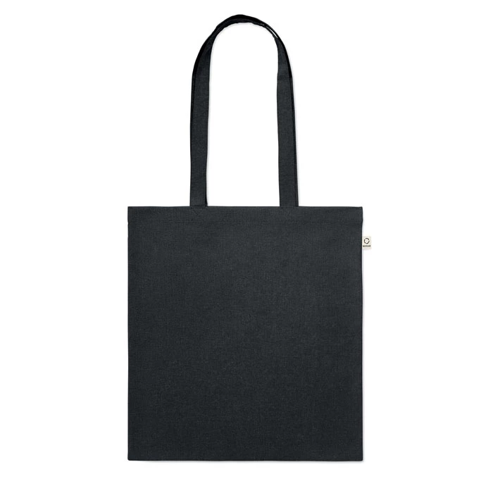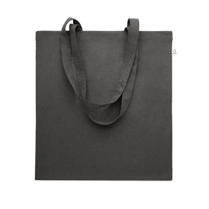 Bawełniana torba na zakupy z prekonsumenckiego recyklingu (70% bawełny z recyklingu i 30% RPET) z długimi uchwytami. 140 gr/m². Ten produkt może się kurczyć po zadrukowaniu.