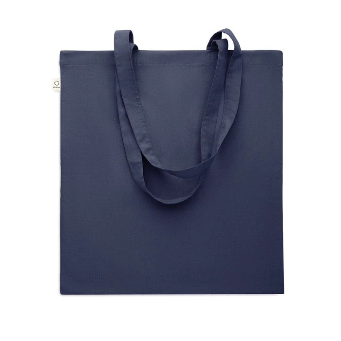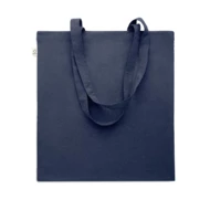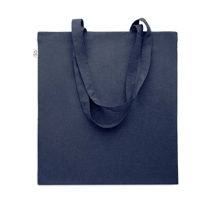 Bawełniana torba na zakupy z prekonsumenckiego recyklingu (70% bawełny z recyklingu i 30% RPET) z długimi uchwytami. 140 gr/m². Ten produkt może się kurczyć po zadrukowaniu.