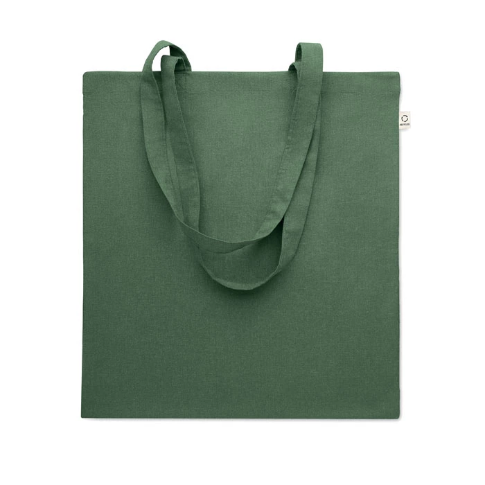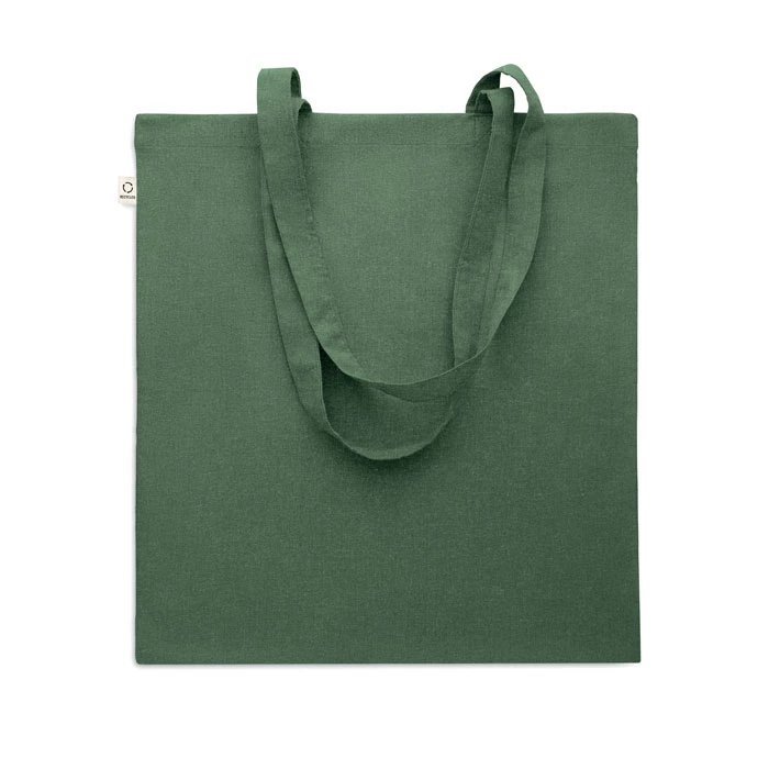 Bawełniana torba na zakupy z prekonsumenckiego recyklingu (70% bawełny z recyklingu i 30% RPET) z długimi uchwytami. 140 gr/m². Ten produkt może się kurczyć po zadrukowaniu.