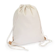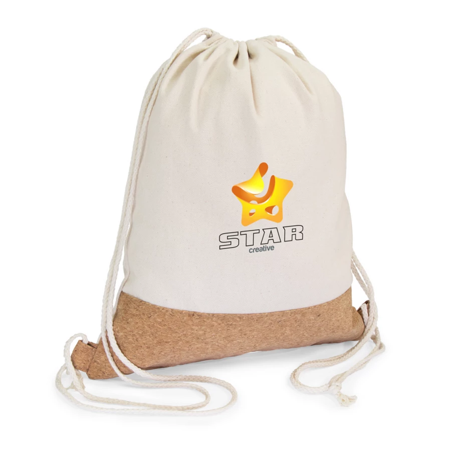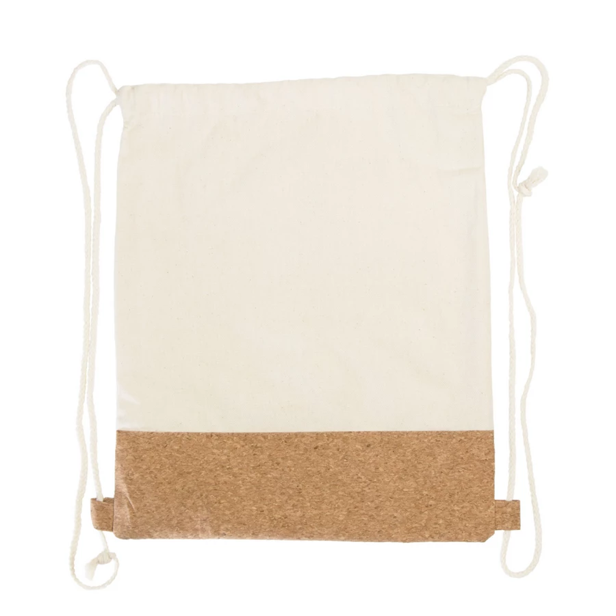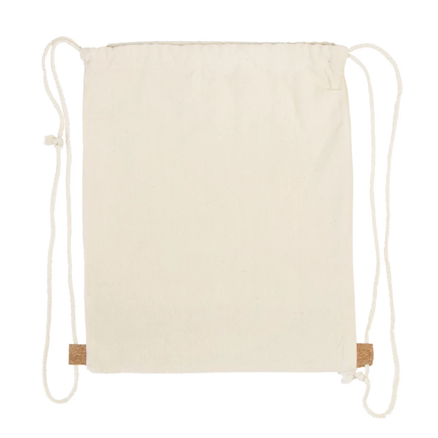 Worek ze sznurkiem umożliwiającym noszenie na plecach, pomieści drobne zakupy lub strój sportowy na siłownię, posiada korkowy element na froncie, produkt wykonany z bawełny o gramaturze 160 g/m2