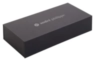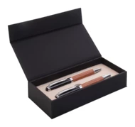 Elegancki zestaw piśmienniczy, metalowy długopis i pióro kulkowe z korpusem z drzewa różanego. W pudełku prezentowym ze sztucznej skóry. Z niebieskim wkładem. Produkt marki André Philippe.