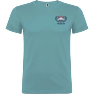 T-shirt z krótkim rękawem. Podwójna tkanina z dodatkiem elastanu przy kołnierzu. Wzmocnione, kryte szwy na karczku. Brak szwów bocznych w wersji dla dorosłych. Usuwalna metka.