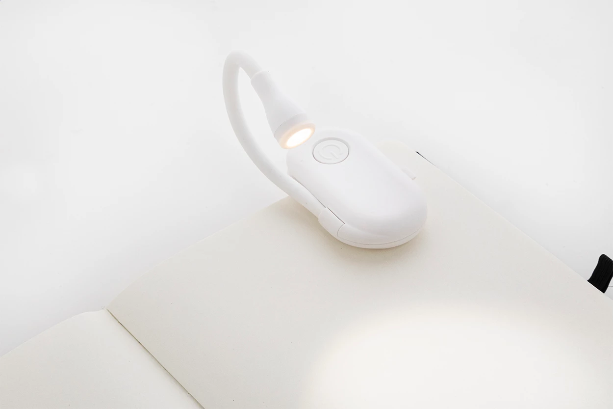 Klips do czytania z ABS z elastyczną lampką LED i wbudowaną ładowalną baterią USB (220 mAh). Z ciepłym, naturalnym i chłodnym trybem światła. W zestawie kabel do ładowania USB.