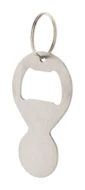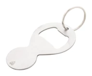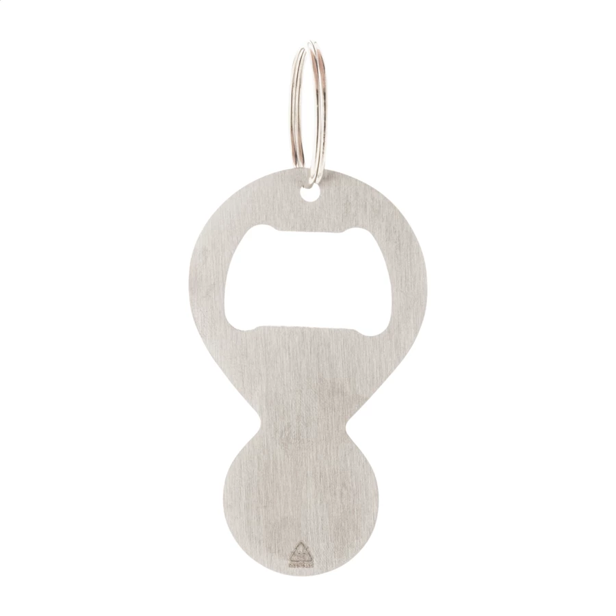 Brelok wykonany z recyklingowanej stali nierdzewnej z otwieraczem do butelek i żetonem do wózka sklepowego.