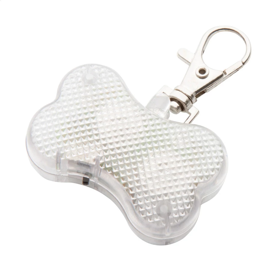 Światełko dla zwierzaka w kształcie kości z migającą diodą LED. Zawiera baterie.