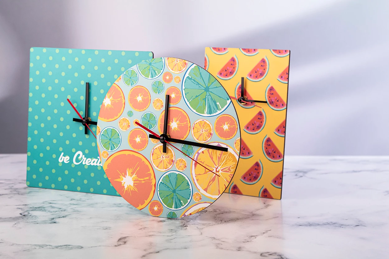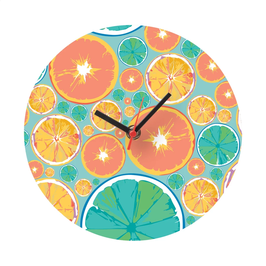 Personalizowany, wykonany z drewnianej płyty HDF, okrągły zegar ścienny z grafiką. Produkt działa na 1 baterie AA, dostarczany bez baterii. Min. zam.: 50 szt.