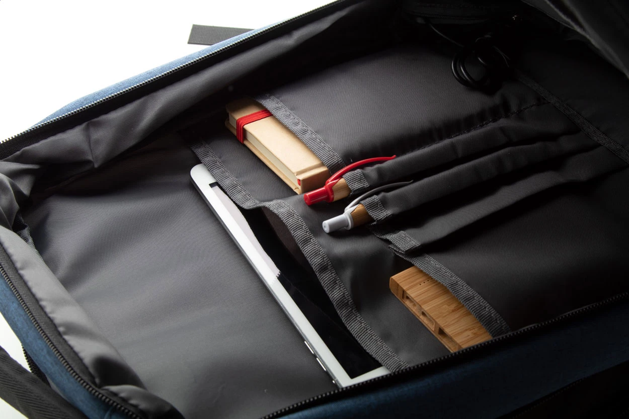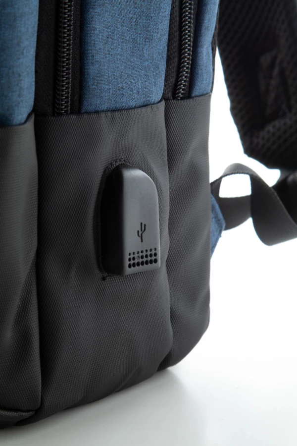 Plecak dwukolorowy z wieloma zapinanymi przegrodami, wyściełanym miejscem na laptop (17'') i tablet oraz ergonomiczną tylną ścianką i paskami. Z przegrodą antykradzieżową. Z zapięciem do walizki i wbudowanym gniazdem USB do power banka. Poliester 400D.