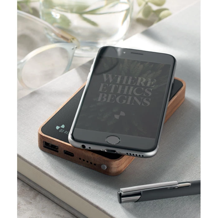 Bezprzewodowa ładowarka 15 W i power bank 4000 mAh z obudową z drewna akacjowego i PU z recyklingu w 58% (40% poliester z recyklingu i 18% PU z recyklingu). Obsługuje technologię szybkiego ładowania (20 W). Wejście/wyjście: Type-C.