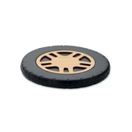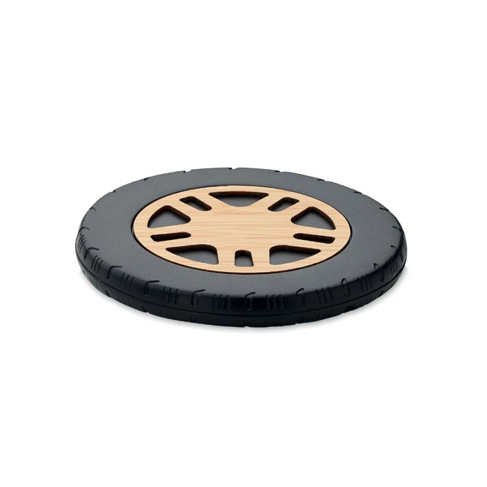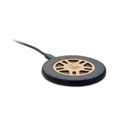 Bezprzewodowa ładowarka 15 W z ABS z recyklingu i bambusową nakładką. Kształt koła samochodowego. Podłącz urządzenie do komputera, umieść na nim smartfon i pozwól mu się naładować. Wyjście: DC 9V/1.10A (15W) do szybkiego ładowania. Kompatybilny z najnowszymi androidami, iPhone® 8 i nowszymi.