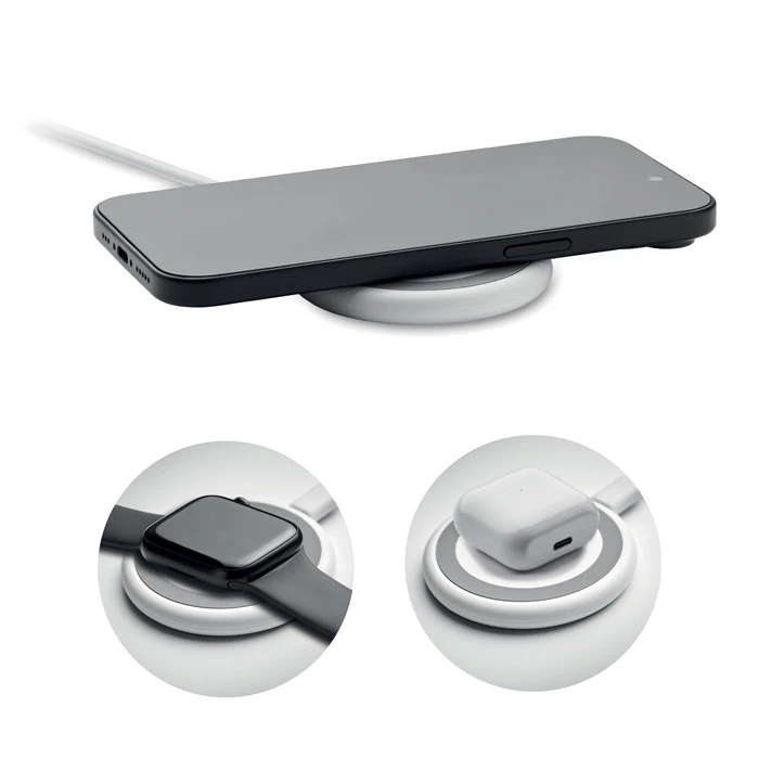 Bezprzewodowa ładowarka 3 w 1 o mocy 15 W. Zawiera magnetyczną ładowarkę bezprzewodową 15 W, ładowarkę do smartwatcha (Samsung® i Apple®) i ładowarkę TWS. Długość kabla: 1M. Wejście: 2 w 1 Type-C i Type-A.