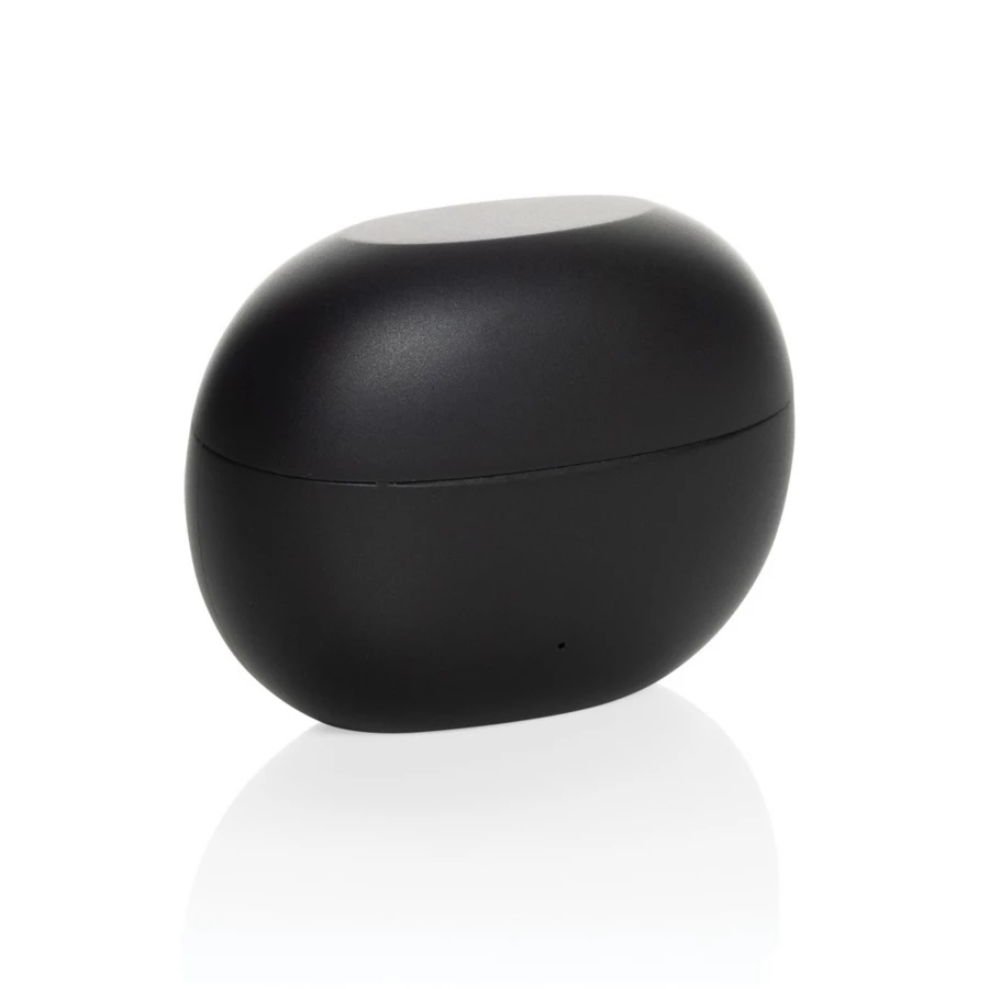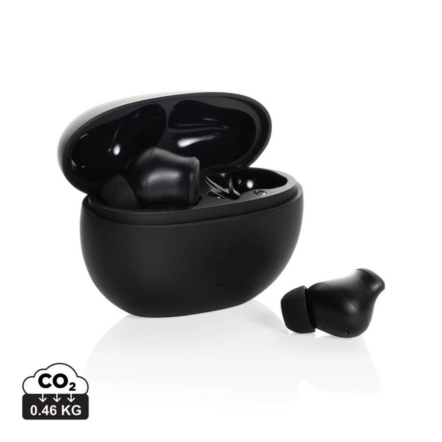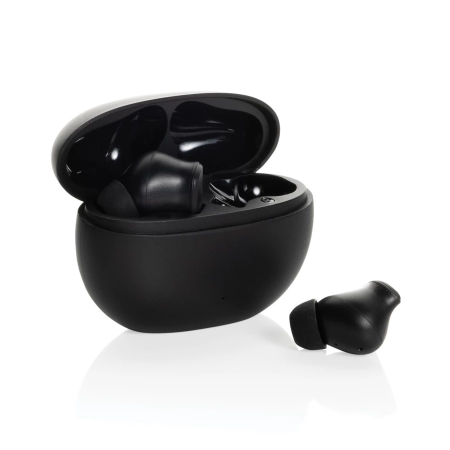 Bezprzewodowe słuchawki duszne, BT 5.3, posiadają funkcje ANC (do 23dB) i ENC, wykonane z ABS z recyklingu z certyfikatem RCS, wbudowany mikrofon, funkcja odbierania połączeń, etui z akumulatorem 200 mAh pełniące funkcję stacji ładującej w komplecie, akumulator słuchawek o pojemności 30 mAh umożliwia odtwarzanie muzyki na średnim poziomie głośności do 5 godzin z ANC lub do 7 godzin bez ANC, ponowne naładowanie za pomocą etui w 1,5 godziny, zasięg do 10 m, 3 rozmiary nakładek dousznych w komplecie, całkowita zawartość materiałów z recyklingu obliczona na podstawie wagi całkowitej produktu: 66%