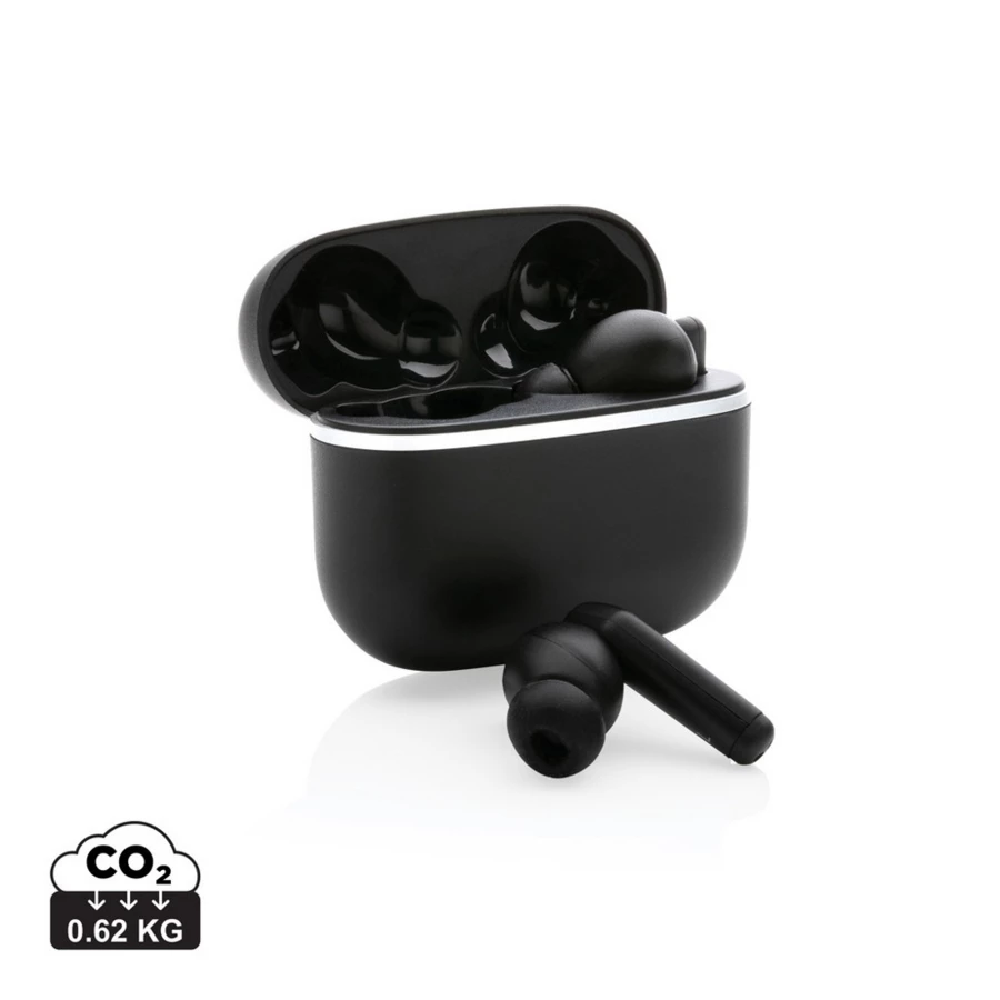 Bezprzewodowe słuchawki douszne TWS 2.0 (True Wireless Stereo), BT 5.3, wykonane z ABS, zawartość materiałów z recyklingu obliczona na podstawie wagi całkowitej przedmiotu: 59%, etui 400 mAh pełniące funkcję stacji ładującej w komplecie, akumulator słuchawek 40 mAh umożliwia odtwarzanie muzyki do 4 godzin, ponowne naładowanie za pomocą etui w 1.5 godziny, zasięg do 10 metrów, w pudełku z certyfikatem FSC® mix, kabel wykonany z TPE bez dodatku PVC w komplecie, ślad węglowy produktu: 0,62 kg CO2
