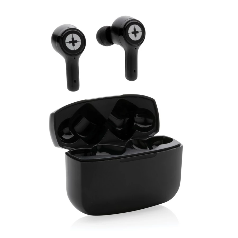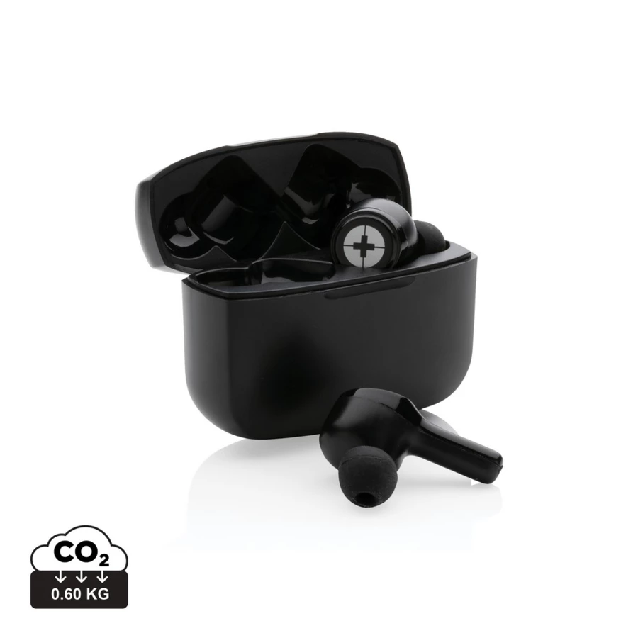 Bezprzewodowe słuchawki douszne TWS (True Wireless Stereo) z ANC (Active Noise Reduction), BT 5.3, wykonane z ABS, funkcja odbierania połączeń, muzyka oraz rozmowy telefoniczne stereo, zawartość materiałów z recyklingu obliczona na podstawie wagi całkowitej przedmiotu: 59%, etui 400 mAh pełniące funkcję stacji ładującej w komplecie, akumulator słuchawek 40 mAh umożliwia odtwarzanie muzyki do 3.5 godzin z ANC lub 4.5 godziny bez ANC, ponowne naładowanie za pomocą etui w 1.5 godziny, zasięg do 10 metrów, stopień ANC: 27DB, w pudełku z certyfikatem FSC® mix, kabel USB typu C wykonany z TPE oraz 3 dodatkowe nasadki w różnych rozmiarach w komplecie, nie zawiera PVC, ślad węglowy produktu: 0,66 kg CO2
