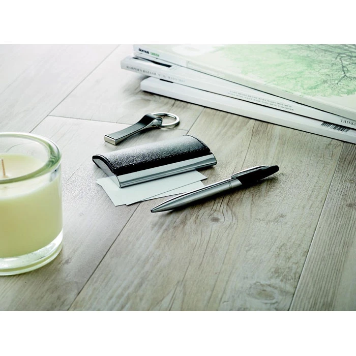 Biznesowy zestaw upominkowy zawierający przekręcany długopis ze stopu cynku, brelok z PU oraz wizytownik. Całość w pudełku. Czarny wkład w długopisie.