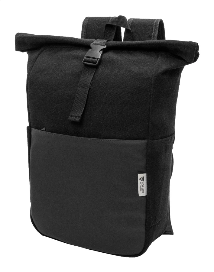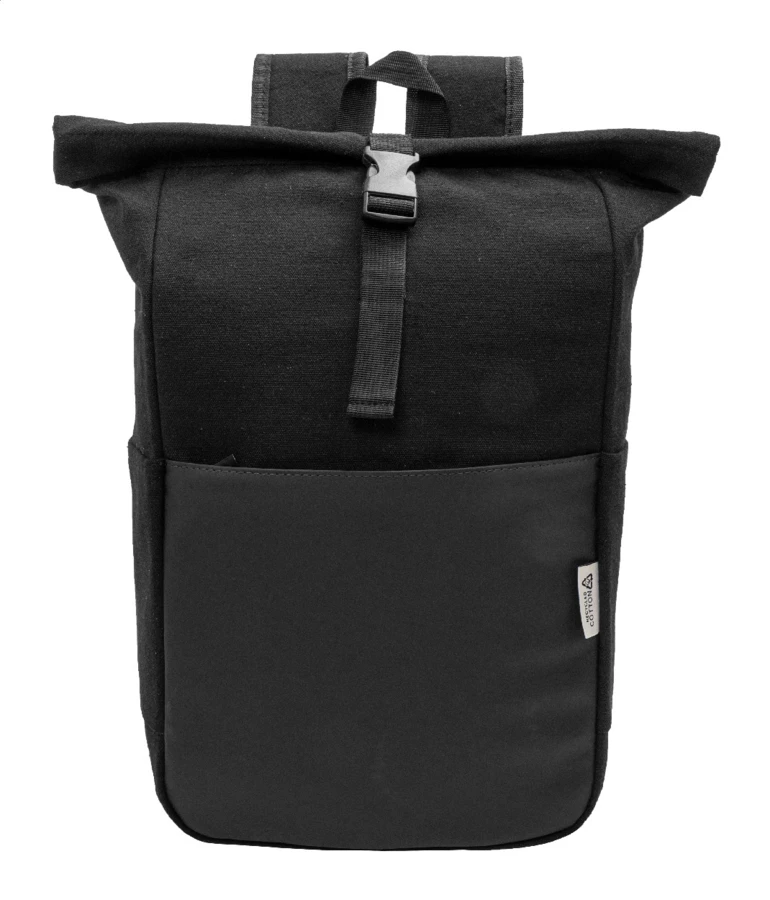 Plecak z płótna z recyklingu z zapięciem na klamrę i kieszenią z przodu zapinaną na zamek, wykonany z miękkiej, recyklingowanej skóry PU. Z wyściełaną przegrodą na laptopa (15"), kieszeniami bocznymi, wyściełanym tyłem i paskami na ramię. Wykonany w 70% z bawełny z recyklingu i w 30% z poliestru RPET. Z charakterystyczną metką z bawełny z recyklingu.