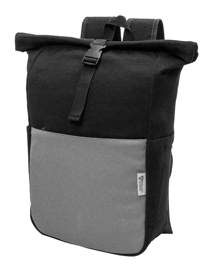 Plecak z płótna z recyklingu z zapięciem na klamrę i kieszenią z przodu zapinaną na zamek, wykonany z miękkiej, recyklingowanej skóry PU. Z wyściełaną przegrodą na laptopa (15"), kieszeniami bocznymi, wyściełanym tyłem i paskami na ramię. Wykonany w 70% z bawełny z recyklingu i w 30% z poliestru RPET. Z charakterystyczną metką z bawełny z recyklingu.