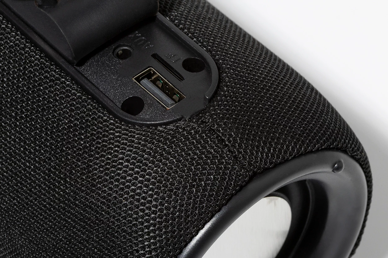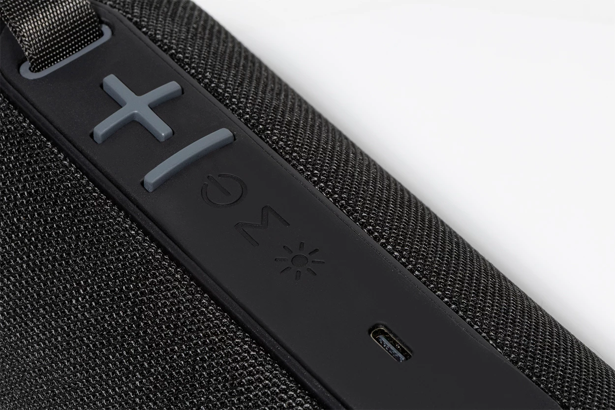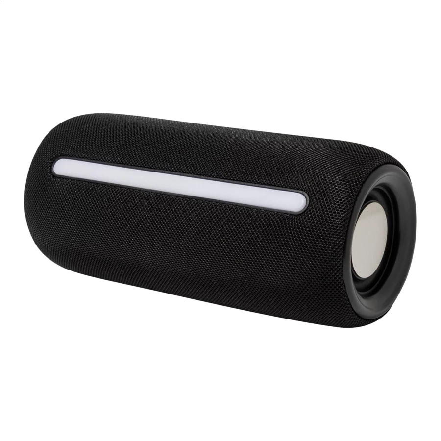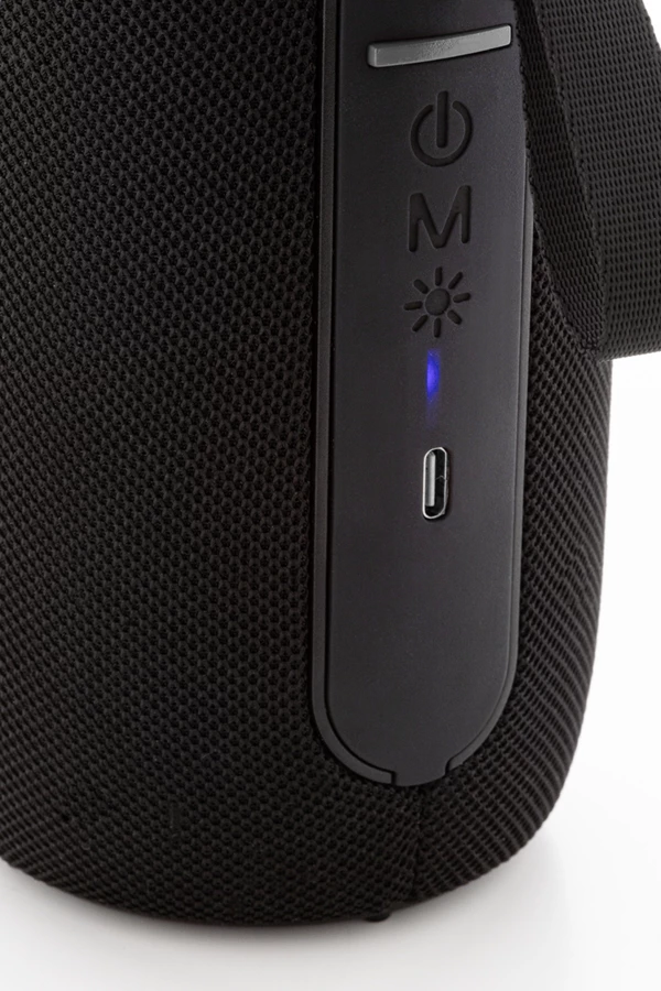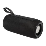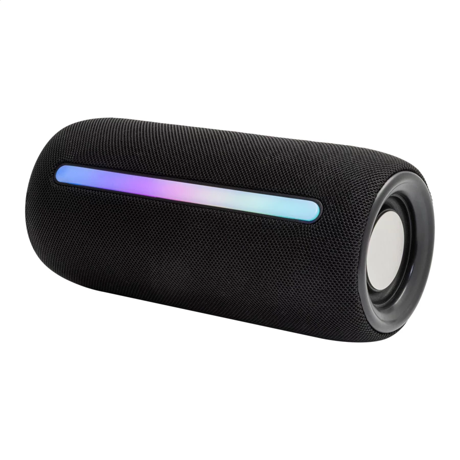 Bezprzewodowy głośnik pokryty tkaniną poliestrową z wielokolorowym podświetleniem LED i paskiem do przenoszenia. Z 2 głośnikami, funkcją głośnomówiącą i wbudowanym akumulatorem (1200 mAh). W zestawie kabel USB do ładowania.