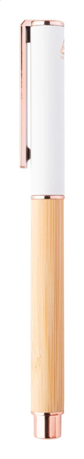 Pióro kulkowe z bambusa i aluminium pochodzącego z recyklingu, z gumowaną skuwką i detalami w kolorze różowego złota.Ze specjalną powłoką pod grawer lustrzany w kolorze różowego złota. Z niebieskim wkładem.