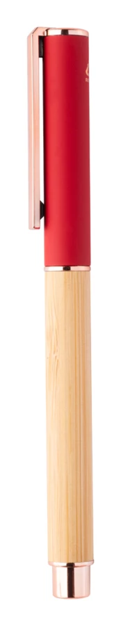 Pióro kulkowe z bambusa i aluminium pochodzącego z recyklingu, z gumowaną skuwką i detalami w kolorze różowego złota.Ze specjalną powłoką pod grawer lustrzany w kolorze różowego złota. Z niebieskim wkładem.