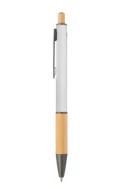 Długopis z aluminium pochodzącego z recyklingu z uchwytem i przyciskiem z bambusa, gumowanym korpusem i elementami z brązu. Z niebieskim wkładem.