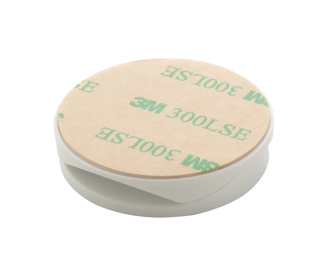 Pokryty bambusem, okrągły, plastikowy uchwyt na telefon z samoprzylepną podstawą.