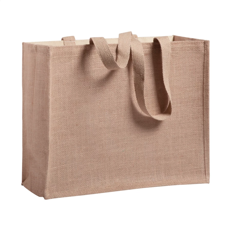 Torba na zakupy z długimi uchwytami z kombinacji laminowanej juty i laminowanej bawełny.
