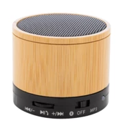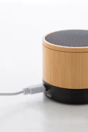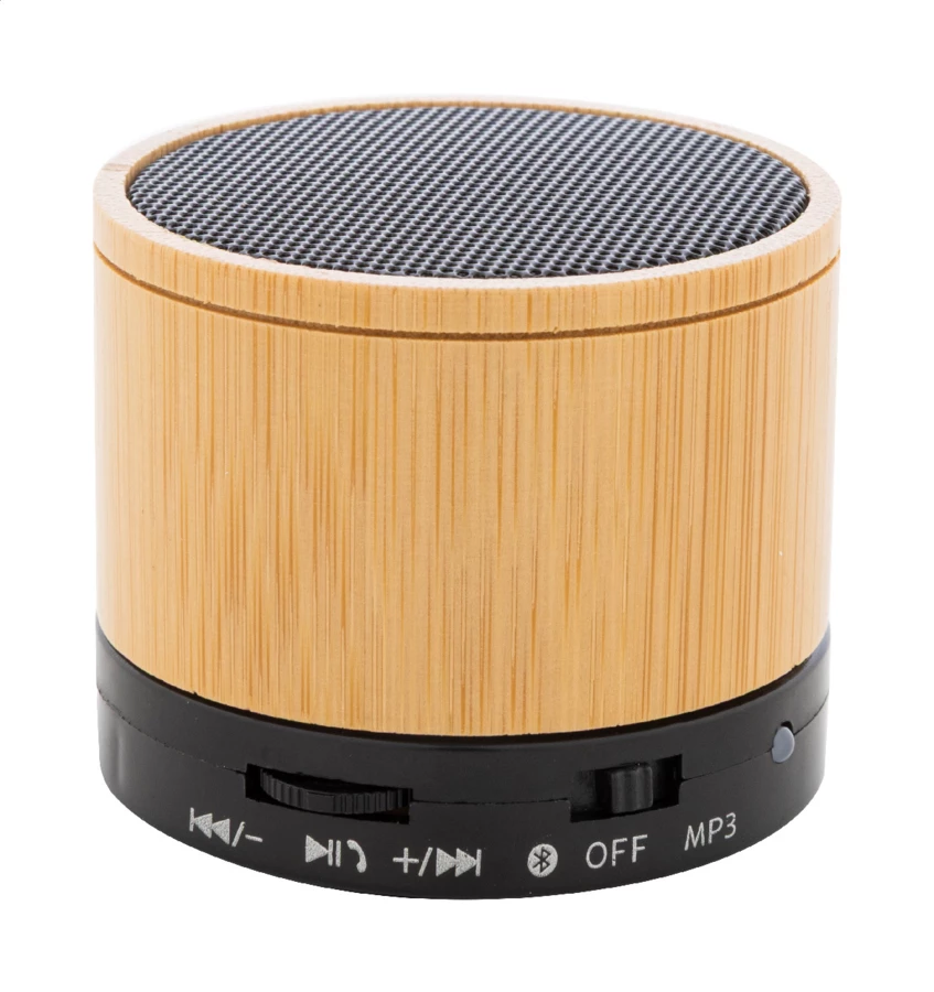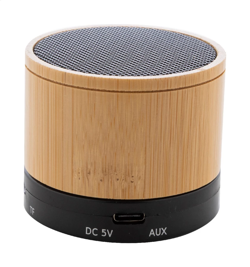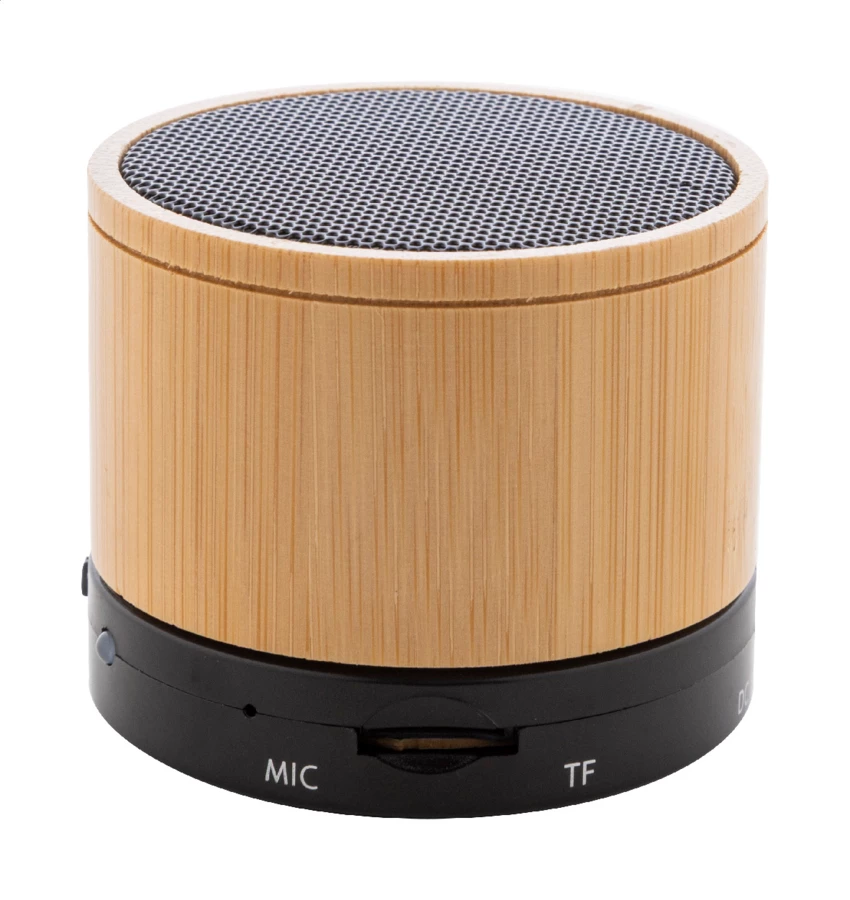 Głośnik bezprzewodowy w obudowie z recyklingowanego ABS i bambusa, z metalową siateczką i akumulatorem (300 mAh). Z funkcją głośnomówiącą i odtwarzaniem plików MP3 z karty micro SD. W zestawie kabel USB do ładowania.