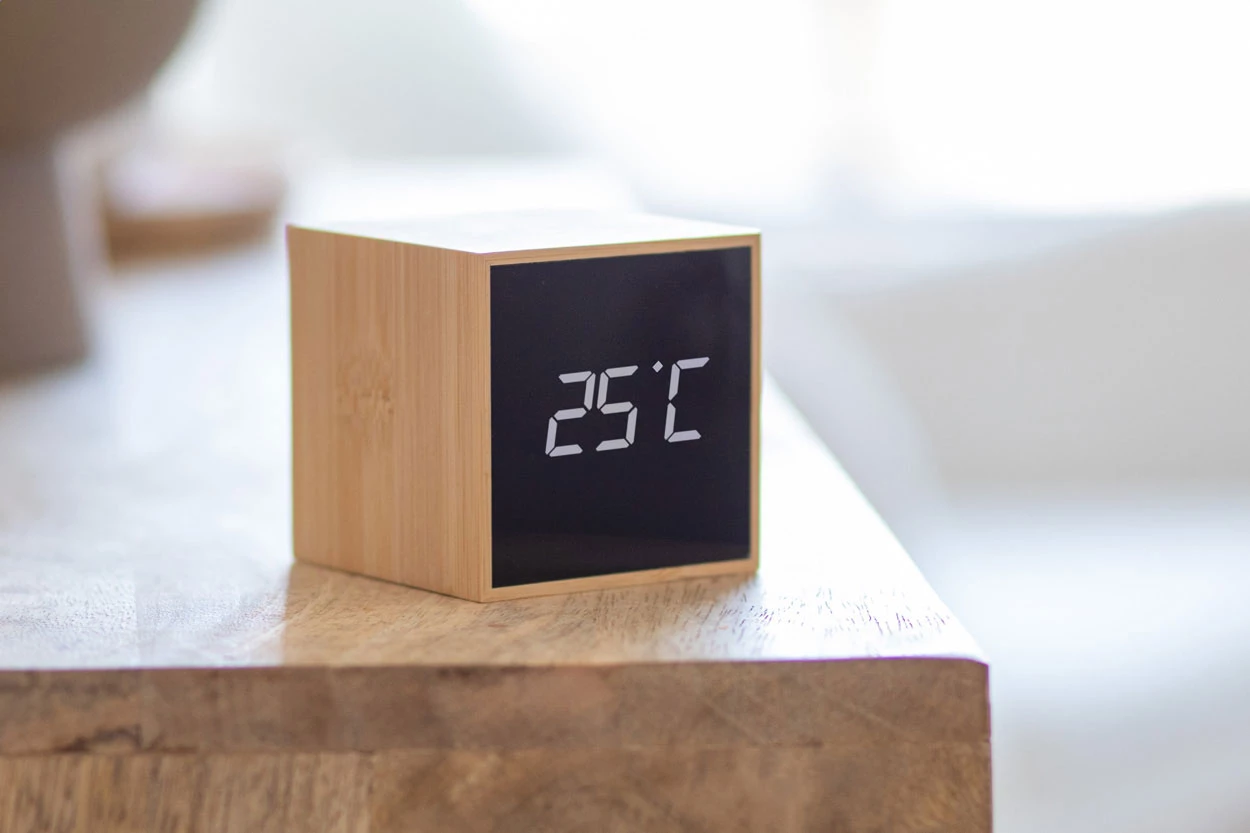 Pokryty bambusem, cyfrowy budzik i termometr z białym wyświetlaczem LED. Może być zasilany przez dołączony kabel ładujący USB lub 3 baterie AAA (bez baterii).
